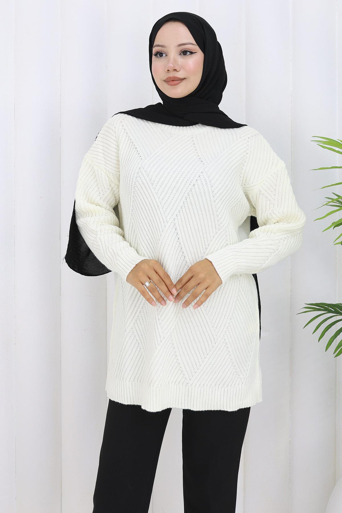 Bisiklet Yaka Baklava Desen Kazak Beyaz HM2836 (2836)
