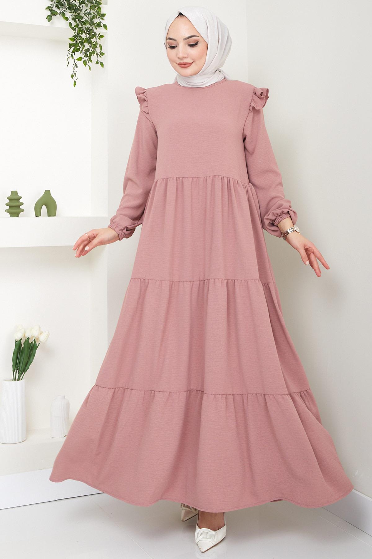 Omuzu Fırfırlı Ayrobin Tesettür Elbise Gül Kurusu HM2062 (2062)